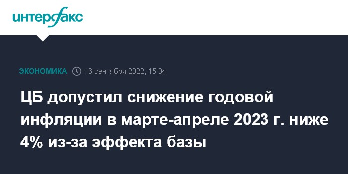 Москва. 16 сентября. INTERFAX.RU - Годовая инфляция в РФ в марте-апреле 2023 года может временно снизиться ниже 4%, но это будет "арифметический эффект" из-за высокой базы 2022 года. Об этом заявила глава Банка России Эльвира Набиуллина на брифинге по итогам совета директоров ЦБ.