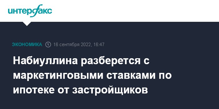Москва. 16 сентября. INTERFAX.RU - Околонулевые ставки по ипотеке от застройщиков могут говорить о завышенной цене на недвижимость, это введение заемщиков в заблуждение, Банк России будет принимать меры, пообещала на пресс-конференции председатель ЦБ Эльвира Набиуллина.
