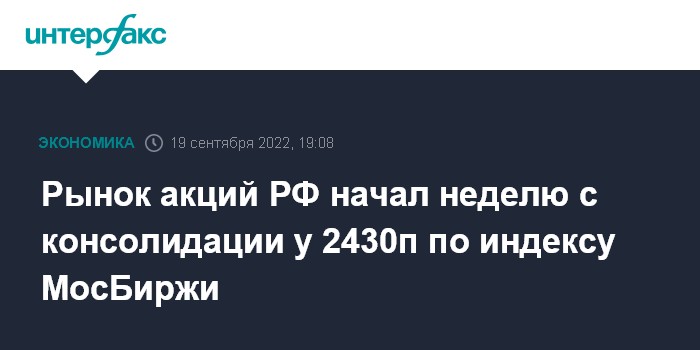 Москва. 19 сентября. INTERFAX.RU - Рынок акций РФ начал неделю с консолидации при смешанной динамике цен blue chips на фоне разнополярных сигналов с внешних площадок в преддверии ужесточения монетарной политики мировых центробанков. Индекс МосБиржи после локального дневного роста выше 2450 пунктов вернулся к закрытию торгов к 2430 пунктам.