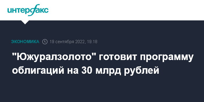 Москва. 19 сентября. INTERFAX.RU - АО "Южуралзолото группа компаний" (ЮГК) планирует до конца 2022 года разместить дебютный выпуск облигаций объемом до 10 млрд рублей и сроком обращения до 5 лет в рамках готовящейся программы облигаций объемом 30 млрд рублей. Это следует из пресс-релиза рейтингового агентства "Эксперт РА" по поводу присвоения компании рейтинга.