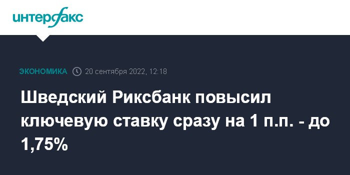 Москва. 20 сентября. INTERFAX.RU - Центробанк Швеции (Riksbank, Риксбанк) повысил ключевую процентную ставку сразу на 1 процентный пункт - до 1,75% годовых с 0,75%. Как показали консенсус-опросы The Wall Street Journal и Trading Economics, аналитики в среднем ожидали повышения ставки на 0,75 п.п.