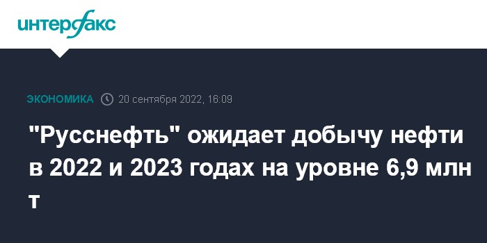 Москва. 20 сентября. INTERFAX.RU - "Русснефть" ожидает добычу нефти по итогам 2022 года на уровне 6,9 млн т, на аналогичный показатель ориентируется в 2003 году , сообщил журналистам президент компании Евгений Толочек.