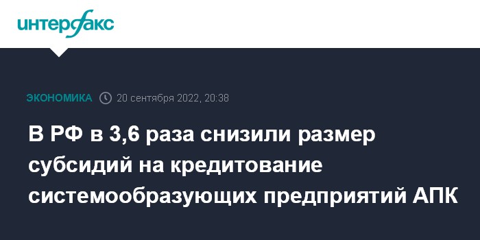 Москва. 20 сентября. INTERFAX.RU - Правительство РФ внесло изменение в распоряжение от 18 марта этого года о выделении системообразующим предприятиям агропромышленного комплекса (АПК) субсидий для кредитования операционной деятельности. В соответствии с ним субсидирование кредитов сокращается в 3,6 раза.