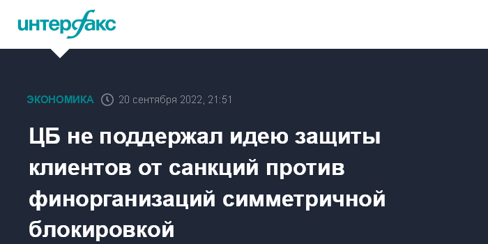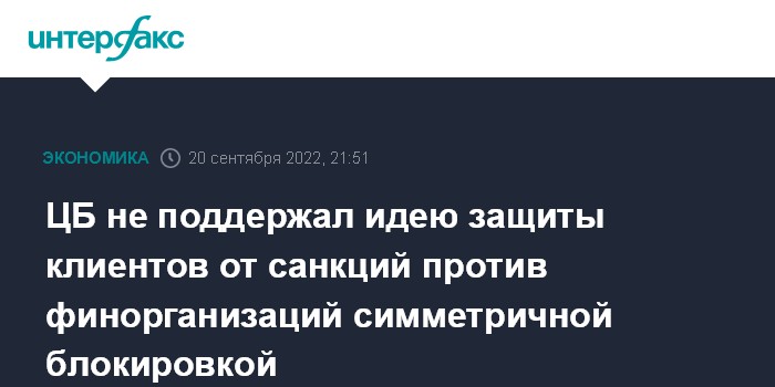 Москва. 20 сентября. INTERFAX.RU - Идея защитить клиентов тех организаций финансового рынка, которые подпадают под иностранные санкции, от блокировки активов посредством принятия закона о симметричной блокировке не нашла поддержки у Банка России.