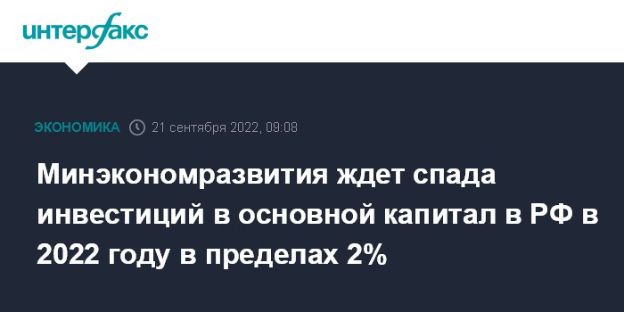 Москва. 21 сентября. INTERFAX.RU - Минэкономразвития прогнозирует снижение инвестиций в основной капитал в 2022 году в пределах 2%, в 2023 году небольшой минус с переходом к росту с 2024 года, сообщил руководитель ведомства Максим Решетников на заседании комитета Совета Федерации по экономической политике.