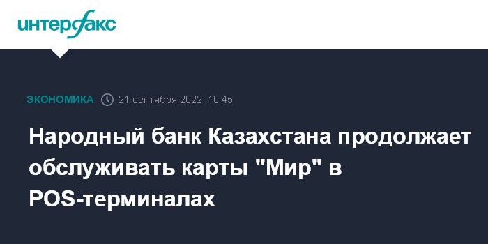 Москва. 21 сентября. INTERFAX.RU - Народный банк Казахстана, крупнейший в стране, перестал обслуживать карты российской платежной системы "Мир" в своей банкоматной сети еще весной, но с тех пор новых ограничений не вводил, сообщили "Интерфаксу" в банке. Картами "Мир" можно расплачиваться через обслуживаемые банком POS-терминалы.
