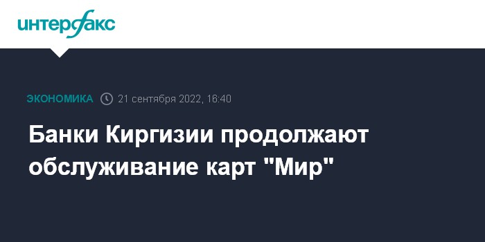 Москва. 21 сентября. INTERFAX.RU - Банки Киргизии не вводили ограничений на работу карт российской платежной системы "Мир", сообщили "Интерфаксу" в Союзе банков страны и call-центрах целого ряда кредитных организаций.