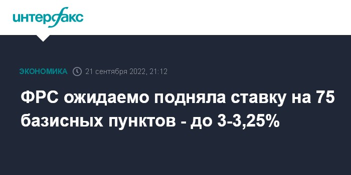 Москва. 21 сентября. INTERFAX.RU - Федеральная резервная система (ФРС) повысила процентную ставку по федеральным кредитным средствам (federal funds rate) на 75 базисных пунктов, теперь ее диапазон составляет 3-3,25% годовых, говорится в сообщении Федерального комитета по операциям на открытых рынках (FOMC) по итогам июльского заседания.