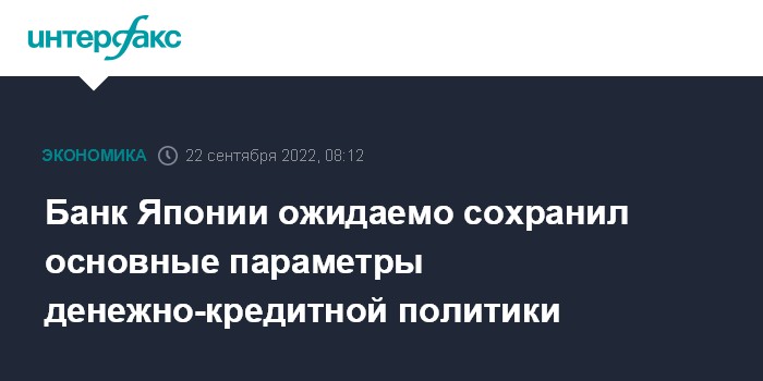 Москва. 22 сентября. INTERFAX.RU - Банк Японии оставил неизменными основные параметры денежно-кредитной политики (ДКП) по итогам завершившегося в четверг двухдневного заседания.