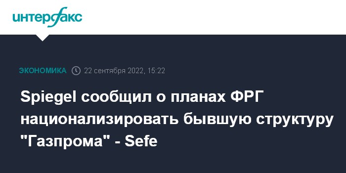 Москва. 22 сентября. INTERFAX.RU - Власти Германии намереваются провести национализацию компании Sefe - бывшей дочерней структуры "Газпрома", пишет Der Spiegel, не называя источников.