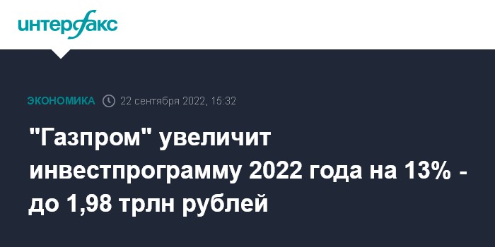 "Газпром" увеличит инвестпрограмму 2022 года на 13% - до 1,98 трлн рублей