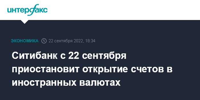 Москва. 22 сентября. INTERFAX.RU - Ситибанк с 22 сентября приостанавливает открытие счетов в иностранных валютах и прекращает прием соответствующих заявлений, говорится в сообщении на сайте кредитной организации.