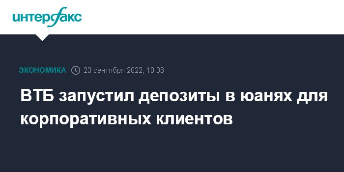 Москва. 23 сентября. INTERFAX.RU - ВТБ запустил депозиты в юанях для корпоративных клиентов, говорится в сообщении кредитной организации.