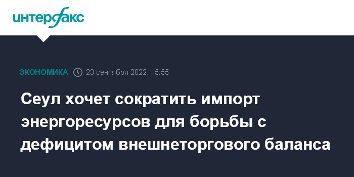 Москва. 23 сентября. INTERFAX.RU - Власти Южной Кореи ищут способы сокращения импорта энергоресурсов для борьбы с рекордным дефицитом внешнеторгового баланса, полученным на фоне скачка цен на нефть и газ в мире и ослабления южнокорейской воны.