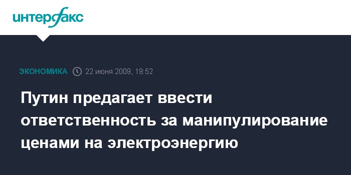 Москва. 22 июня. INTERFAX.RU - Власти предполагают ввести ответственность за манипулирование ценами на рынке электроэнергии, сообщил премьер Владимир Путин на заседании президиума правительства в понедельник.