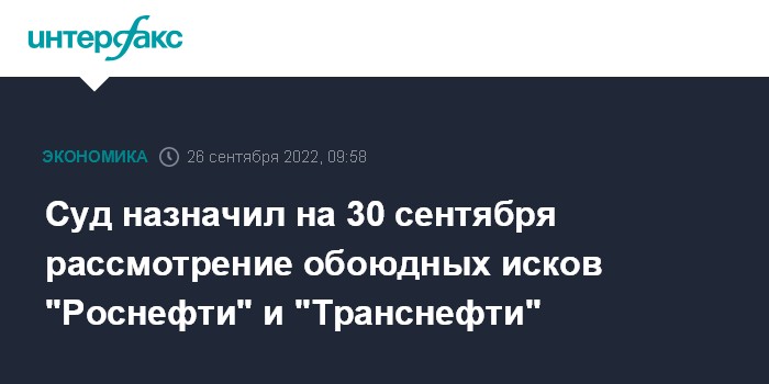 Москва. 26 сентября. INTERFAX.RU - Арбитражный суд Москвы назначил на 30 сентября рассмотрение исков "Роснефти" и "Транснефти" друг к другу на несколько миллиардов рублей, следует из арбитражной картотеки.