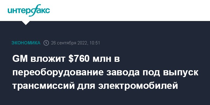 Москва. 26 сентября. INTERFAX.RU - Американский автопроизводитель General Motors Co. (GM) вложит $760 млн в переоборудование предприятия в Толедо (штат Огайо) под выпуск трансмиссий для электромобилей.