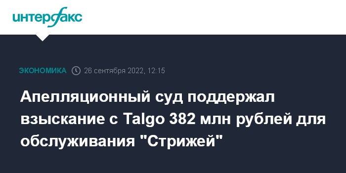 Апелляционный суд поддержал взыскание с Talgo 382 млн рублей для обслуживания "Стрижей"