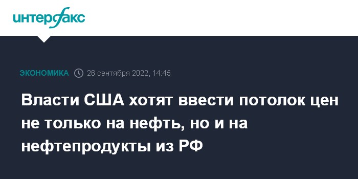 Москва. 26 сентября. INTERFAX.RU - Предложенный США потолок цен на российскую нефть, по мнению Вашингтона, должен также распространяться и на нефтепродукты, передает в понедельник агентство Bloomberg со ссылкой на заместителя помощника министра финансов Кэтрин Волфрам.