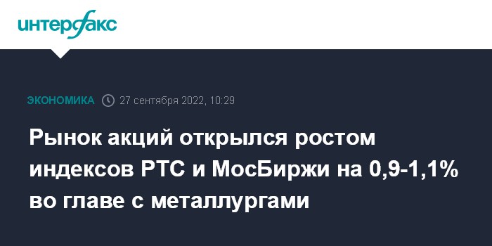 Москва. 27 сентября. INTERFAX.RU - Рынок акций РФ открылся во вторник коррекционным ростом цен blue chips на фоне улучшения внешней фондовой и сырьевой конъюнктуры (растут нефть и металлы) после недавнего падения; индексы РТС и МосБиржи за минуту торгов прибавили 0,9-1,1%, при этом лидируют акции металлургических компаний.