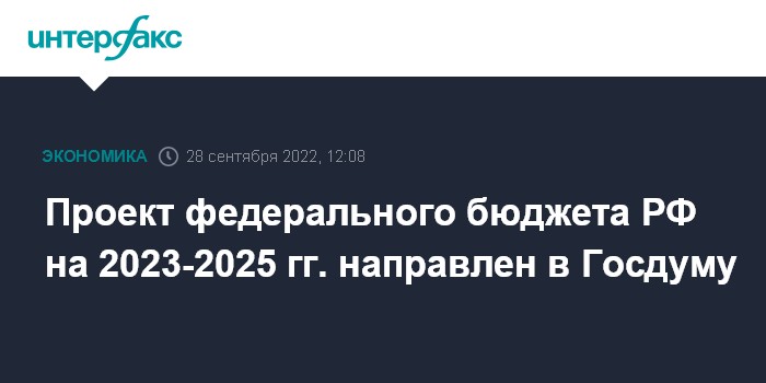 Москва. 28 сентября. INTERFAX.RU - Правительство РФ направило в Госдуму проект федерального бюджета на 2023 г. и на плановый период 2024 и 2025 гг., сообщила пресс-служба кабинета министров.