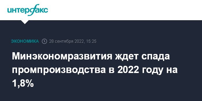 Москва. 28 сентября. INTERFAX.RU - В России в 2022 году спад промпроизводства ожидается на уровне 1,8% с последующем снижением на 1,3% в 2023 году, говорится в прогнозе Минэкономразвития, внесенном в составе бюджетного пакета в Госдуму.