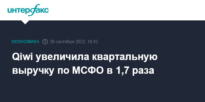 Москва. 28 сентября. INTERFAX.RU - Во втором квартале 2022 года Qiwi plc увеличила общую чистую выручку по МСФО в 1,7 раза в годовом измерении - до 10,2 млрд рублей, говорится в сообщении группы.