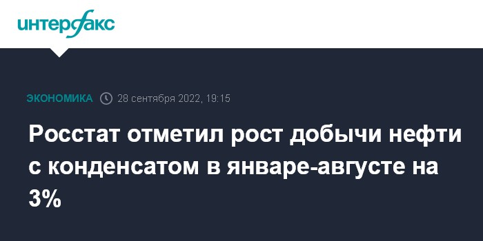 Москва. 28 сентября. INTERFAX.RU - Добыча нефти с учетом газового конденсата в августе 2022 года составила 45 млн т, увеличившись на 2,1% по сравнению с августом 2021 года, сообщает Росстат. К июлю 2022 года она снизилась на 1,1%. За восемь месяцев 2022 года нефти с конденсатом добыто 354 млн т, что на 3,1% больше, чем за январь-август 2021 года.