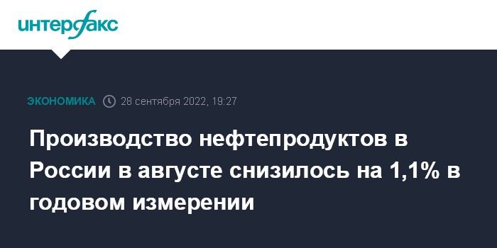 Москва. 28 сентября. INTERFAX.RU - В августе 2022 года производство кокса и нефтепродуктов в России в годовом измерении снизилось на 1,1%, по сравнению с июлем - на 1,8%, говорится в материалах Росстата.
