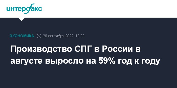 Москва. 28 сентября. INTERFAX.RU - В августе 2022 года производство сжиженного природного газа выросло на 59% в годовом исчислении, до 2,4 млн тонн, сообщил Росстат. К июлю 2022 года производство СПГ выросло на 2,9%.