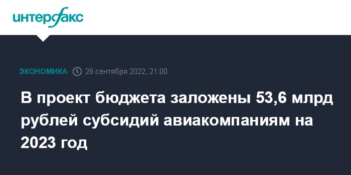Москва. 28 сентября. INTERFAX.RU - Российские авиакомпании в 2023 году могут получить по основным программам субсидирования суммарно 53,6 млрд рублей, следует из внесенного в Госдуму проекта бюджета на ближайшую трехлетку.