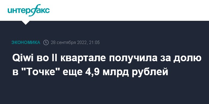 Москва. 28 сентября. INTERFAX.RU - Во втором квартале 2022 года Qiwi получила условную часть вознаграждения в рамках сделки по продаже доли в АО "Точка" банку "Открытие" в размере 4,86 млрд рублей, следует из отчета Qiwi.