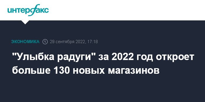 Москва. 29 сентября. INTERFAX.RU - Сеть "Улыбка радуги", работающая в формате дрогери, с начала 2022 года увеличилась на 93 магазина в России, сообщили "Интерфаксу" в пресс-службе компании. В том числе в Петербурге и Ленинградской области открылись 40 магазинов сети, в Москве - 30. До конца года сеть откроет еще четыре десятка точек.