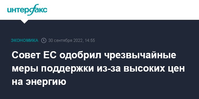 Москва. 30 сентября. INTERFAX.RU - Министры энергетики стран ЕС согласовали в Брюсселе чрезвычайные меры помощи домохозяйствам и предприятиям стран Евросоюза в условиях резкого роста цен на энергию, пишет Le Figaro.