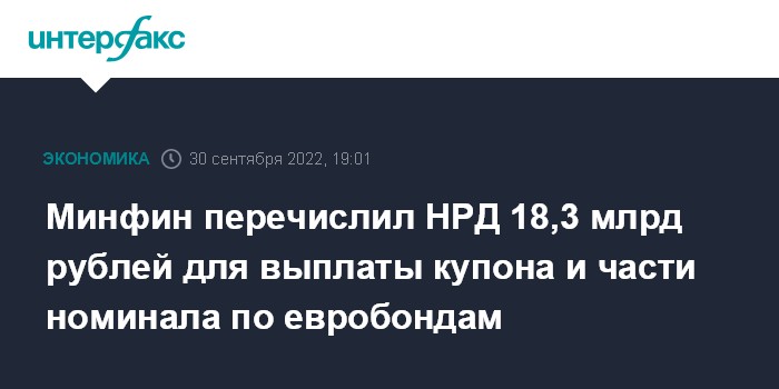 Москва. 30 сентября. INTERFAX.RU - Минфин в соответствии с указом президента от 22 июня перечислил в Национальный расчетный депозитарий (НРД) 18,3 млрд рублей (эквивалент $319,3 млн) для выплаты купонного дохода и части номинальной стоимости по суверенным еврооблигациям Росссии с окончательным сроком погашения в 2030 году.