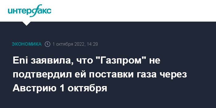 Москва. 1 октября. INTERFAX.RU - "Газпром" не подтвердил поставки газа в Австрию в адрес компании Eni, сообщила итальянская компания на своем сайте.