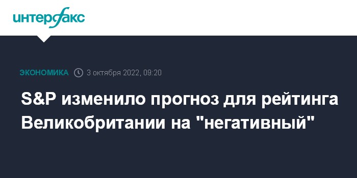 Москва. 3 октября. INTERFAX.RU - Агентство S&P Global Ratings подтвердило долгосрочные и краткосрочные рейтинги Великобритании в иностранной и национальной валютах на уровне "AA/A-1+". Однако прогноз долгосрочных рейтингов был изменен на "негативный" со "стабильного", говорится в пресс-релизе агентства.