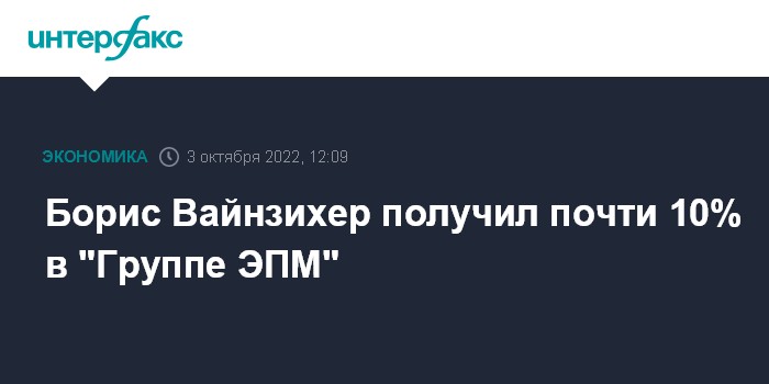 Москва. 3 октября. INTERFAX.RU - ООО "Томкеа", принадлежащее Борису Вайнзихеру, стало владельцем почти 10% долей в уставном капитале ООО "Группа ЭПМ", свидетельствуют данные ЕГРЮЛ.