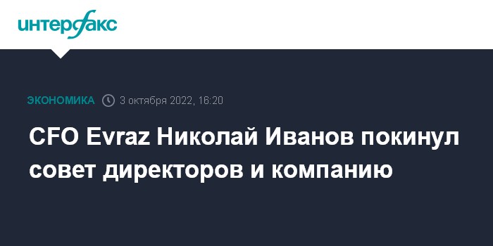 Москва. 3 октября. INTERFAX.RU - CFO Evraz Николай Иванов ушел из совета директоров и покинул компанию, сообщил "Интерфаксу" официальный представитель Evraz.