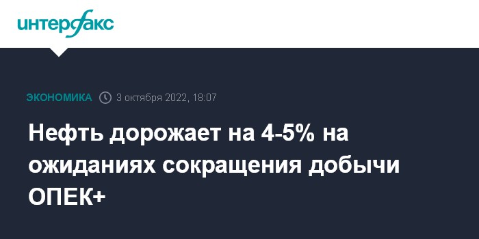 Москва. 3 октября. INTERFAX.RU - Нефтяные котировки стремительно повышаются на торгах в понедельник на фоне сообщений о том, что ОПЕК+ может резко снизить добычу по итогам октябрьского заседания.