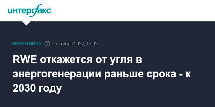 Москва. 4 октября. INTERFAX.RU - Германская энергетическая компания RWE AG намерена отказаться от использования угля в энергогенерации к 2030 году, а не к 2038 году, как планировалось ранее.