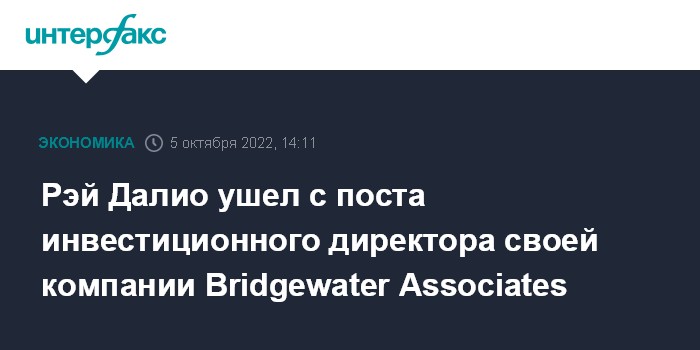 Москва. 5 октября. INTERFAX.RU - Известный инвестор и миллиардер Рэй Далио покинул пост инвестиционного директора крупнейшего в США хэдж-фонда Bridgewater Associates, пишет The Wall Street Journal.