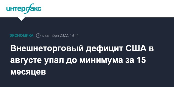 Москва. 5 октября. INTERFAX.RU - Дефицит внешнеторгового баланса США в августе 2022 года сократился на 4,4% - до $67,4 млрд, сообщило американское Министерство торговли.