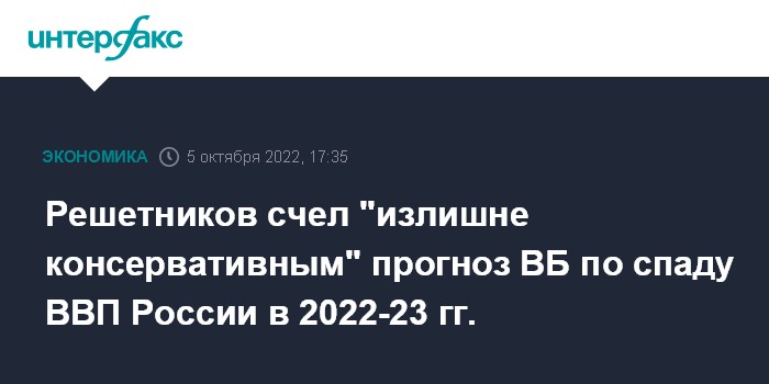 Москва. 5 октября. INTERFAX.RU - Прогноз Всемирного банка (ВБ) по снижению ВВП РФ на 2022-2023 годы на 4,5% и 3,6% соответственно "излишне консервативен", не в полной мере учитывает принимаемые правительством РФ решения и меры, заложенные в бюджет, сказал глава Минэкономразвития РФ Максим Решетников журналистам в среду в Москве.