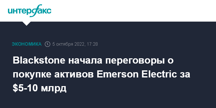 Москва. 5 октября. INTERFAX.RU - Инвестиционная компания Blackstone Inc. ведет переговоры о покупке ряда активов американской инжиниринговой Emerson Electric Co., сообщает Bloomberg со ссылкой на информированные источники.