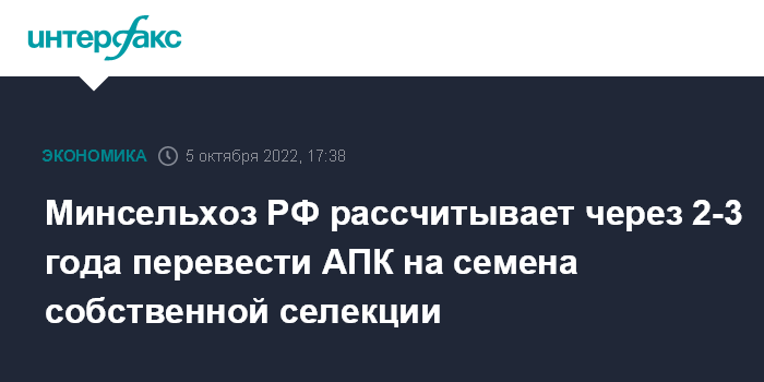 Москва. 5 октября. INTERFAX.RU - Минсельхоз РФ рассчитывает через два-три года перевести агропромышленный комплекс (АПК) на семена отечественней селекции.
