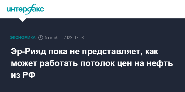 Москва. 5 октября. INTERFAX.RU - Министр энергетики Саудовской Аравии Абдулазиз бен Сальман пока не знает, как будет работать ценовой потолок на российскую нефть и кто его поддержит. Он сказал об этом на пресс-конференции в Вене после министерской встречи ОПЕК+.