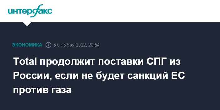 Москва. 5 октября. INTERFAX.RU - TotalEnergies продолжит поставки СПГ из России до тех пор, пока в Европе не будут введены санкции в отношении газа, заявил гендиректор компании Патрик Пуянне на конференции Energy Intelligence. Об этом сообщает Bloomberg.