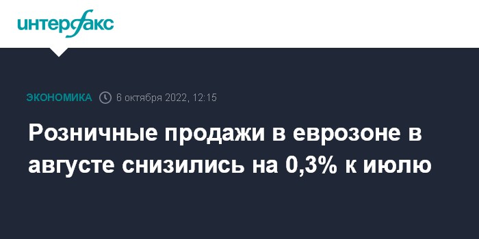 Москва. 6 октября. INTERFAX.RU - В августе 2022 года в еврозоне розничные продажи сократились на 0,3% к июлю, показали данные Статистического управления Европейского союза (Eurostat).