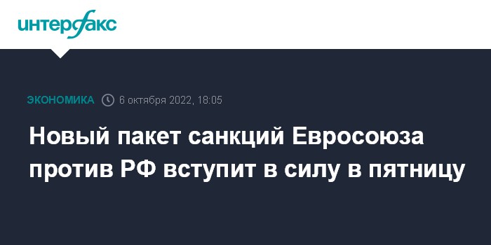Москва. 6 октября. INTERFAX.RU - Очередной пакет санкций Евросоюза в отношении России, который, в частности, предусматривает юридическую базу для введения "потолка" цен на нефть из РФ, вступит в силу в пятницу, сообщается в Официальном журнале ЕС.